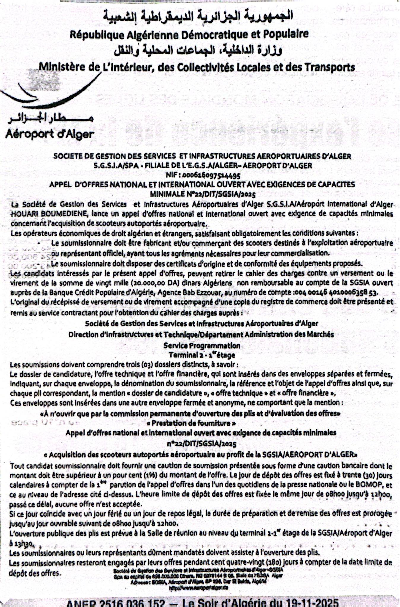 Cet appel d’offre lancé par l’aéroport d’Alger pour l’acquisition de scooters autoportés aéroportuaires est ouvert aux opérateurs économiques algériens et étrangers répondant à plusieurs conditions obligatoires.