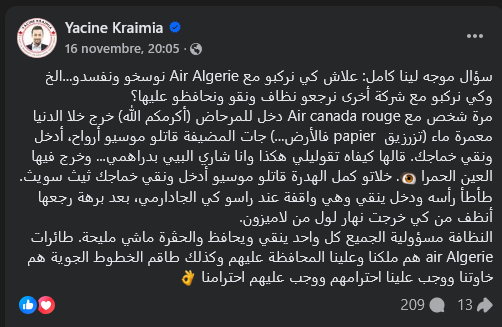 Le témoignage se conclut par un message adressé directement aux passagers d’Air Algérie. Les avions de la compagnie nationale sont décrits comme un bien collectif qui “nous appartient à tous”.