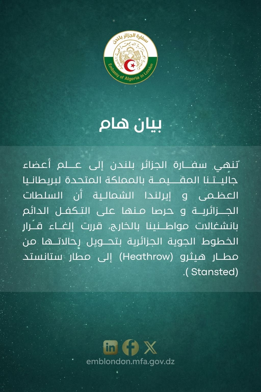En effet, l’Ambassade d’Algérie à Londres a annoncé que la décision de Air Algérie de transférer ses vols de l’aéroport de Londres Heathrow vers Londres Stansted a été annulée.