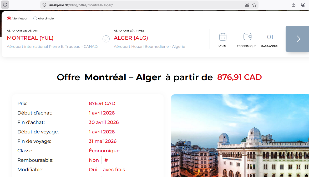 Bonne nouvelle pour les Algériens du Canada. Air Algérie propose actuellement des billets à moins de 900 dollars pour des vols au départ de Montréal.