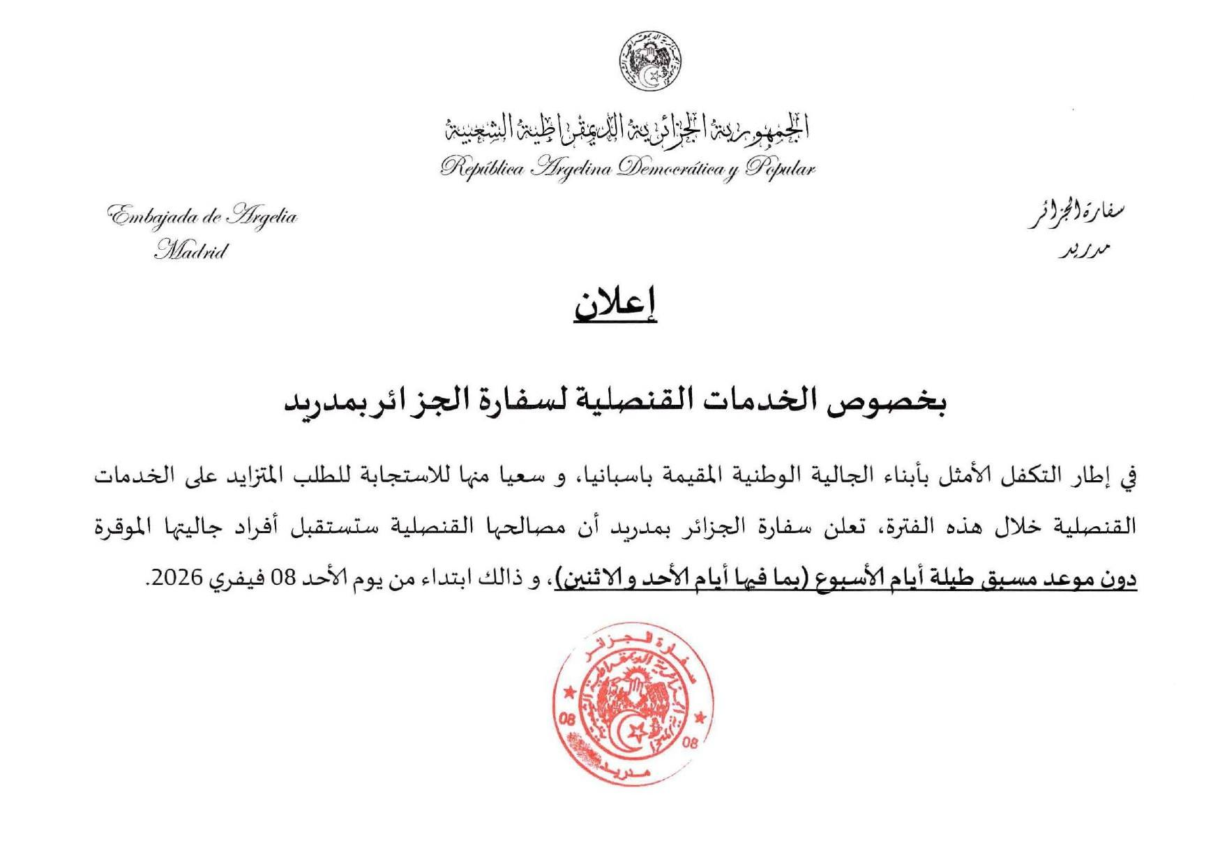 L’ambassade d’Algérie à Madrid a annoncé, ce dimanche 8 février 2026, l’ouverture quotidienne de ses services consulaires, sans rendez-vous préalable, afin de répondre aux besoins croissants de la communauté nationale établie en Espagne.