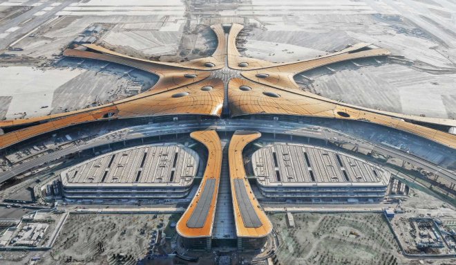 Situé à 46 km de Pékin, cette gigantesque plateforme aéroportuaire a été imaginée par l’architecte anglo-irakienne Zaha Hadid et conçue par ADP Ingénierie, filiale d’Aéroports de Paris.
