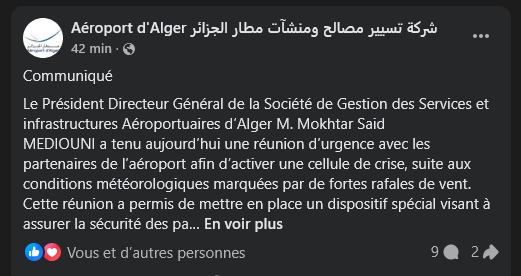 « Le Président Directeur Général de la Société de Gestion des Services et infrastructures Aéroportuaires d’Alger M. Mokhtar Said MEDIOUNI a tenu aujourd’hui une réunion d’urgence avec les partenaires de l’aéroport afin d’activer une cellule de crise, suite aux conditions météorologiques marquées par de fortes rafales de vent » lit-on dans le communiqué de l’aéroport.